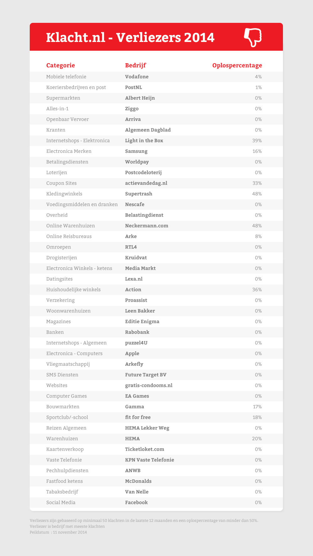 Het afgelopen jaar klaagden Nederlanders het meest over mobiele telefonie aanbieders, koeriers- en postbedrijven en super-markten. Van de bijna 100.000 klachten die binnen kwamen, waren er maar liefst 4.288 klachten over de mobiele telefonie sector. Met een oplospercentage van slechts 4% is Vodafone binnen die categorie de slechtste klachtenoplosser van het jaar. Onder de top 50 categorieën zijn ‘Koeriersbedrijven en Post’ en ‘Supermarkten’ respectievelijke op de tweede en derde plek gekomen met het meest aantal klachten. Albert Heijn heeft met een oplospercentage van 0% de minste oplossingen bewerkstelligd van alle Nederlandse supermarkten binnen die categorie.